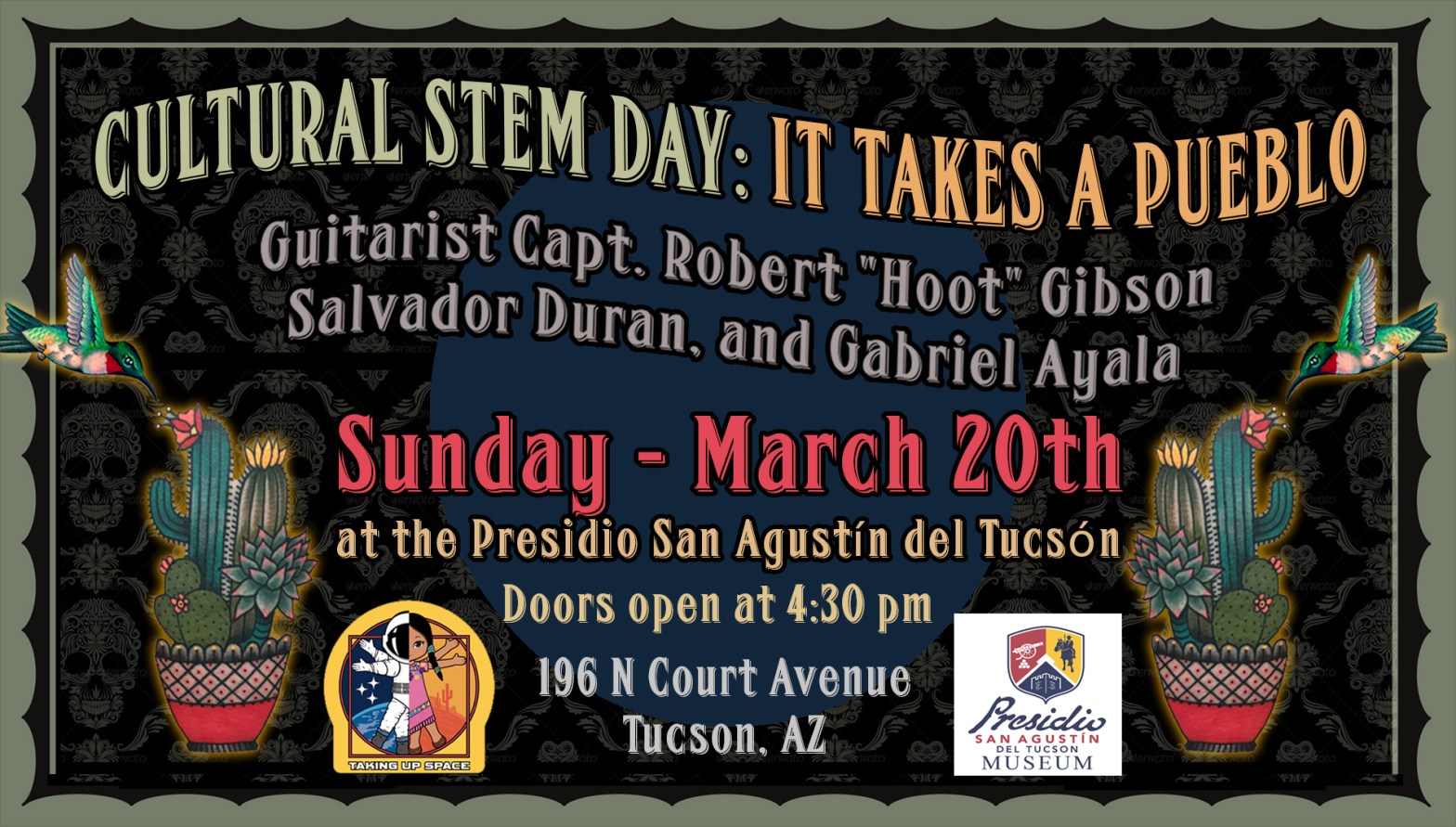 Cultural STEM Day: It Takes a Pueblo SUNDAY, MARCH 20, 2022 4:30 PM – 8:00 PM at the Presidio San Agustín del Tucsón Gabriel Ayala Fundraiser with Las Azaleas, Salvador Duran, featuring Gabriel Ayala, and very special guest astronaut Capt. Robert “Hoot” Gibson and Mayor Romano! Also featuring space art by Michelle Rouch, space jewelry byContinueContinue reading “You’re Invited”